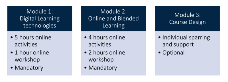 Individual sparring and supervision as well as technical assistance will be available during the module, e.g. to produce relevant online learning material, design the course page in Brightspace, evaluate the course design and identify next steps for the development of the specific course.
