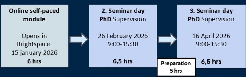 The course also aims at furthering the sharing of experiences among university supervisors within their faculty to enhance the co-development of local practices and collegial support.